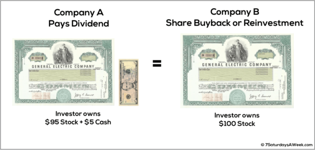The only difference is that the Company B investor gets to choose when and how much stock is liquidated – Company A management chooses for their investors. The Company A investor can also choose to reinvest the dividend and bring their total equity back up to $100 – same as the company reinvestment and buyback scenarios.