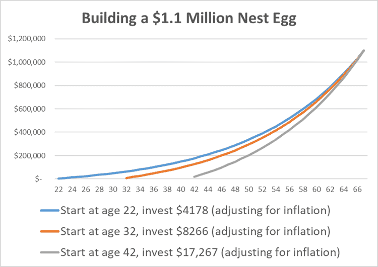 If you start at age 22, $4178/year is enough to reach $1.1 million by age 67 (assuming 6.5% inflation-adjusted returns) if you increase it each year to account for inflation).