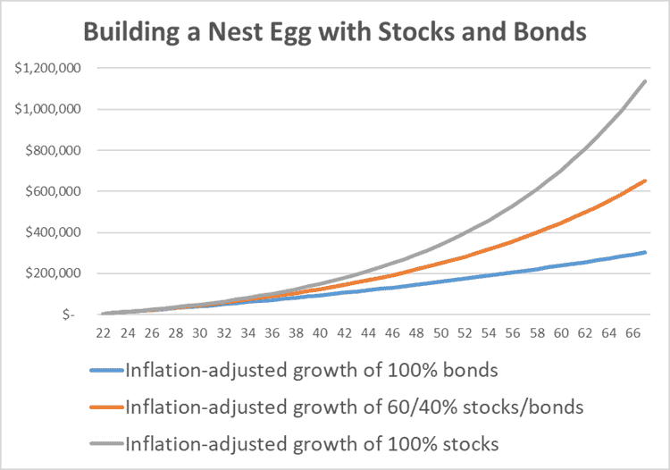 Here’s a comparison of a 6.6% annual inflation-adjusted growth of 100% stocks to the 4.72% growth of a 60/40 stock/bond portfolio, and to the 1.9% return of a 100% bond portfolio.