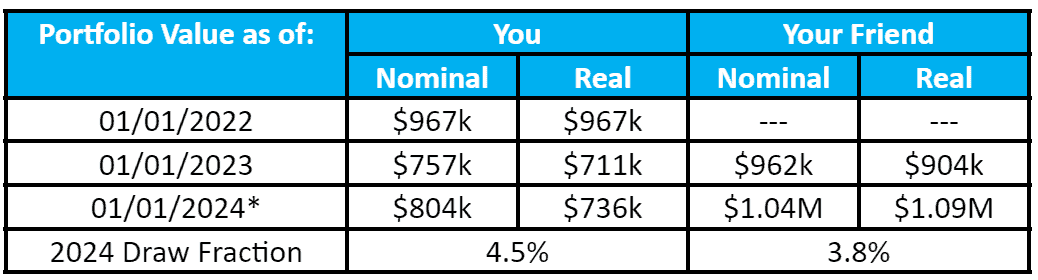 As the table shows, your hypothetical portfolio is now worth $736k after adjusting for inflation from 01/01/2022; while your friend’s is worth $1.09 million. Your $33k real-dollar draw is thus 4.5 percent of your portfolio, while his $38k draw is just 3.8 percent of his.